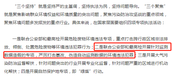 二是聯(lián)合公安部和最高檢開展針對監(jiān)測數(shù)據(jù)造假的專項,嚴厲打擊篡改、偽造自動監(jiān)測數(shù)據(jù)的環(huán)境違法犯罪;